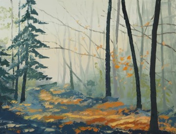 La matinée est fraîche et ce sera un jour d’été indien. Ce sentier couvert de feuilles mortes invite les promeneurs.