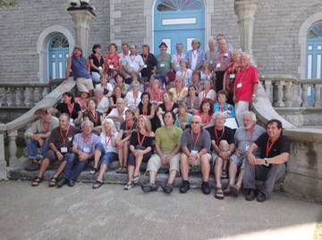 Photo du groupe d'artistes devant l'église de Sainte-Flore.Je suis le huitième à partir de gauche de la dernière rangée.