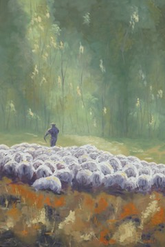 Le jour sera chaud; ce berger emmène ses brebis au frais en bordure du boisé